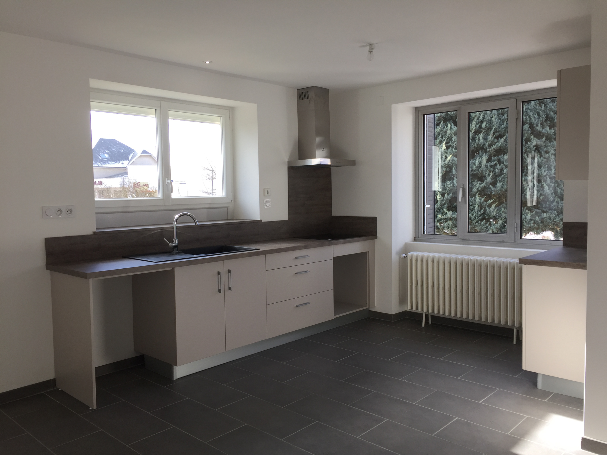 – Etage 1 : une entrée, un séjour avec une cuisine américaine équipée (hotte aspirante + plaque induction), 2 chambres, un wc ;