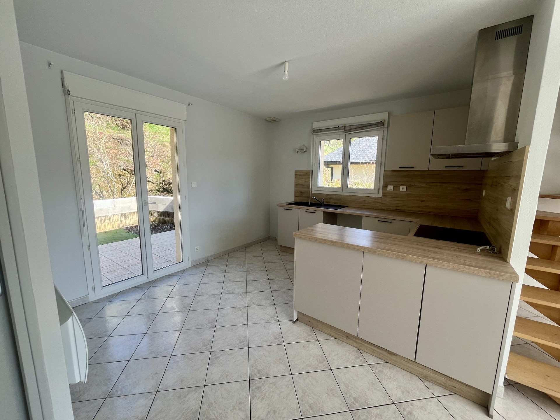 – 1er niveau : une entrée avec placard, un séjour lumineux ouvrant sur une terrasse plein sud, une cuisine américaine semi-équipée (plaque de cuisson et hotte) donnant sur une grande terrasse et un jardinet, ainsi qu’un WC indépendant.
