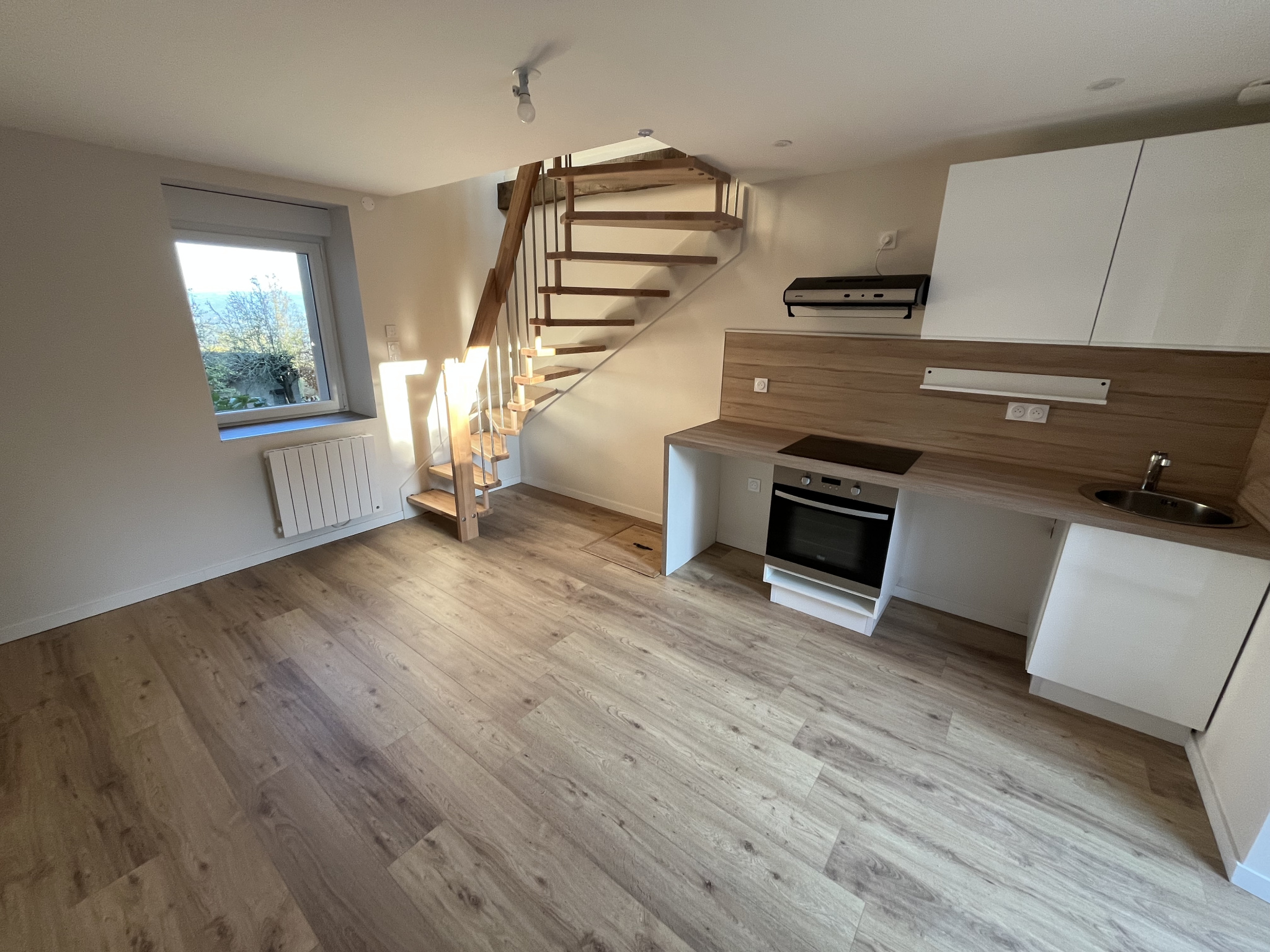 Dans maison rénovée, petite copropriété de 2 appartements, proche de Druelle et à environ 10 minutes de Bourran et 15 minutes du centre-ville de Rodez, beau T2 Duplex de 34 m2, entièrement rénové, comprenant :